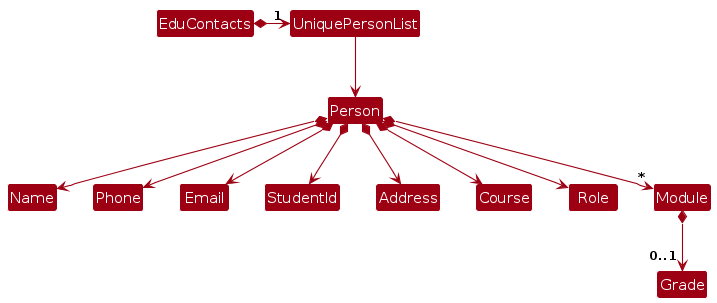 Person object stores StudentId, Name, Address, Phone, Email, Role, Course objects.Module objects which is optional.Person objects (e.g., results of a search query) as a separate filtered list which is exposed to outsiders as an unmodifiable ObservableList<Person> that can be 'observed' e.g. the UI can be bound to this list so that the UI automatically updates when the data in the list change.UserPref object that represents the user’s preferences. This is exposed to the outside as a ReadOnlyUserPref objects.Note: An alternative (arguably, a more OOP) model is given below. It has a Role list in the AddressBook, which Person references. This allows AddressBook to only require one Role object per unique role, instead of each Person needing their own Role objects.
